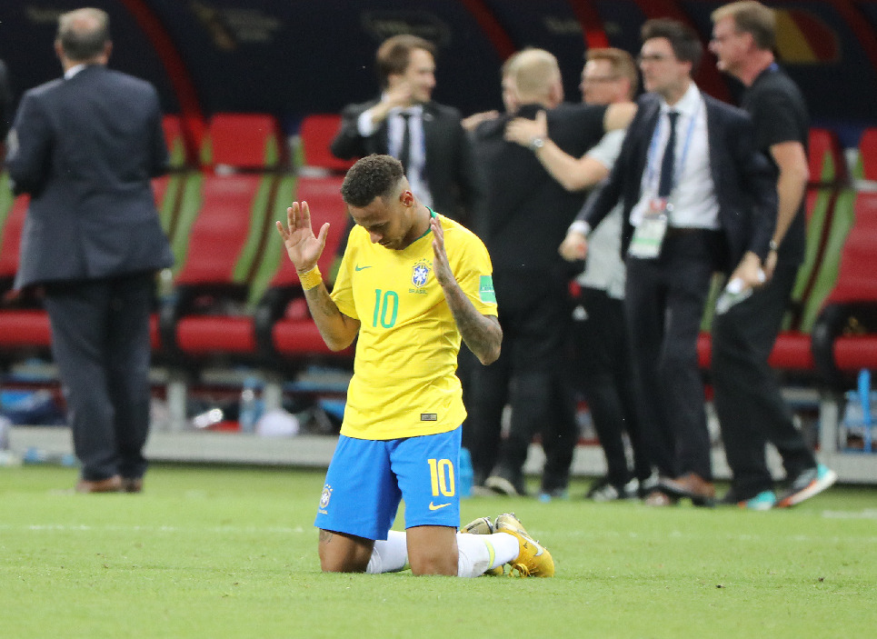 Neymar of Brazil kneels on the pitch after the 2018 FIFA World Cup quarter-final match between Brazil and Belgium in Kazan, Russia, July 6, 2018. Belgium won 2-1 and advanced to the semi-finals. (Xinhua/Bai Xueqi)