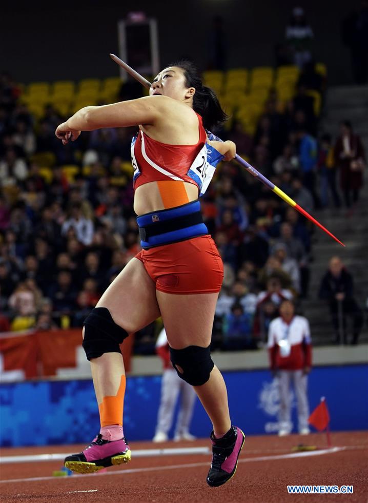 Zhang Li of China competes during the women's javelin throw final of track and field at the 7th CISM Military World Games in Wuhan, capital of central China's Hubei Province, Oct. 25, 2019. (Xinhua/Jin Liangkuai)