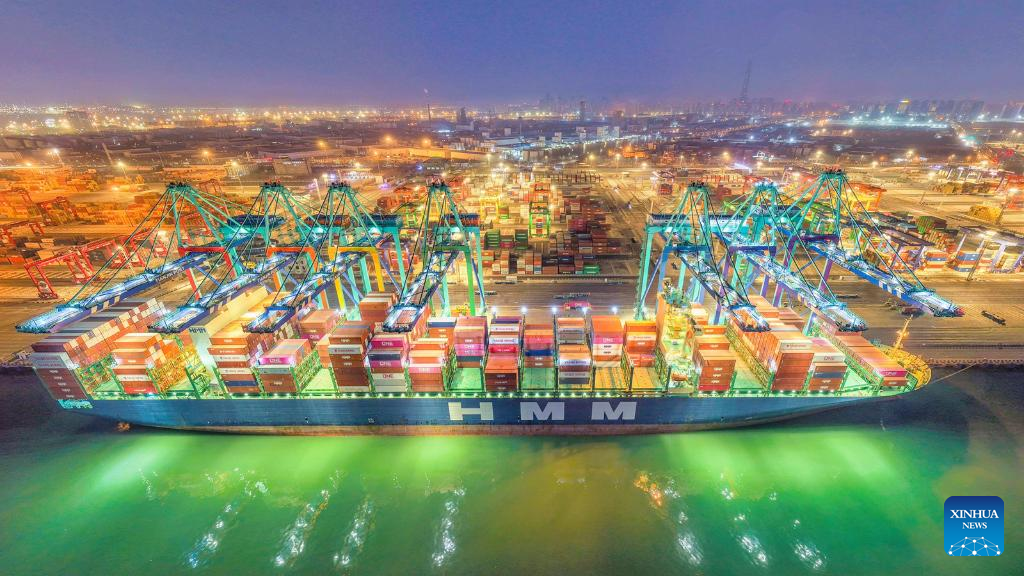 A drone photo taken on March 16, 2026 shows a view of the Tianjin Port in Binhai New Area, north China's Tianjin. (Photo by Du Penghui/Xinhua)