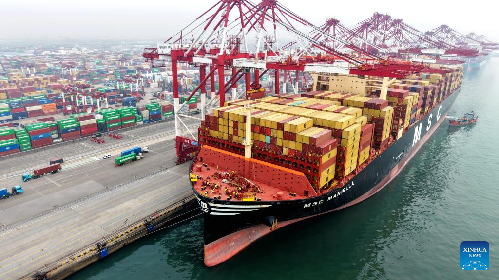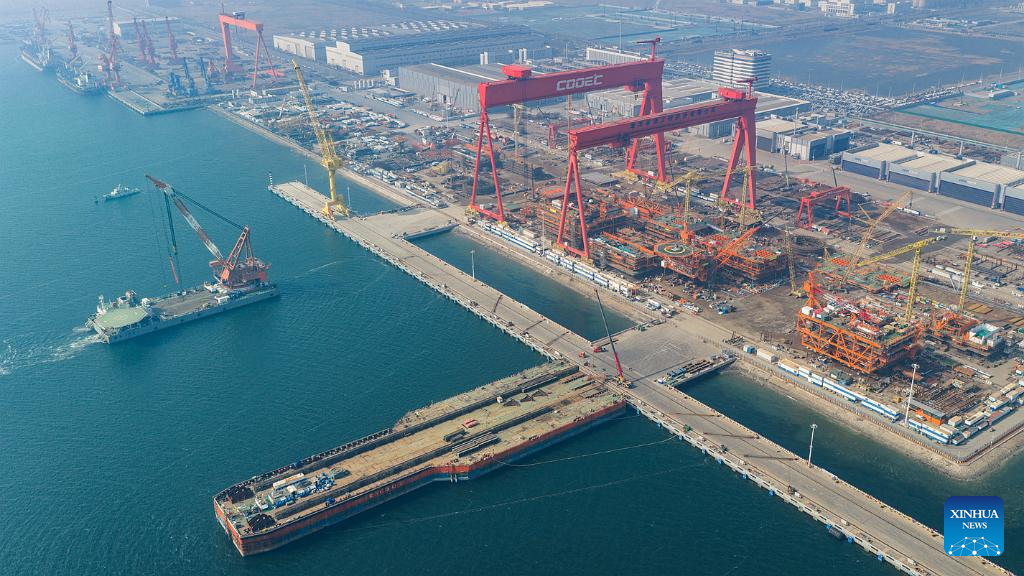 A drone photo taken on March 16, 2026 shows a tanker docking at Qingdao Port in Qingdao, east China's Shandong Province. (Photo by Yu Fangping/Xinhua)