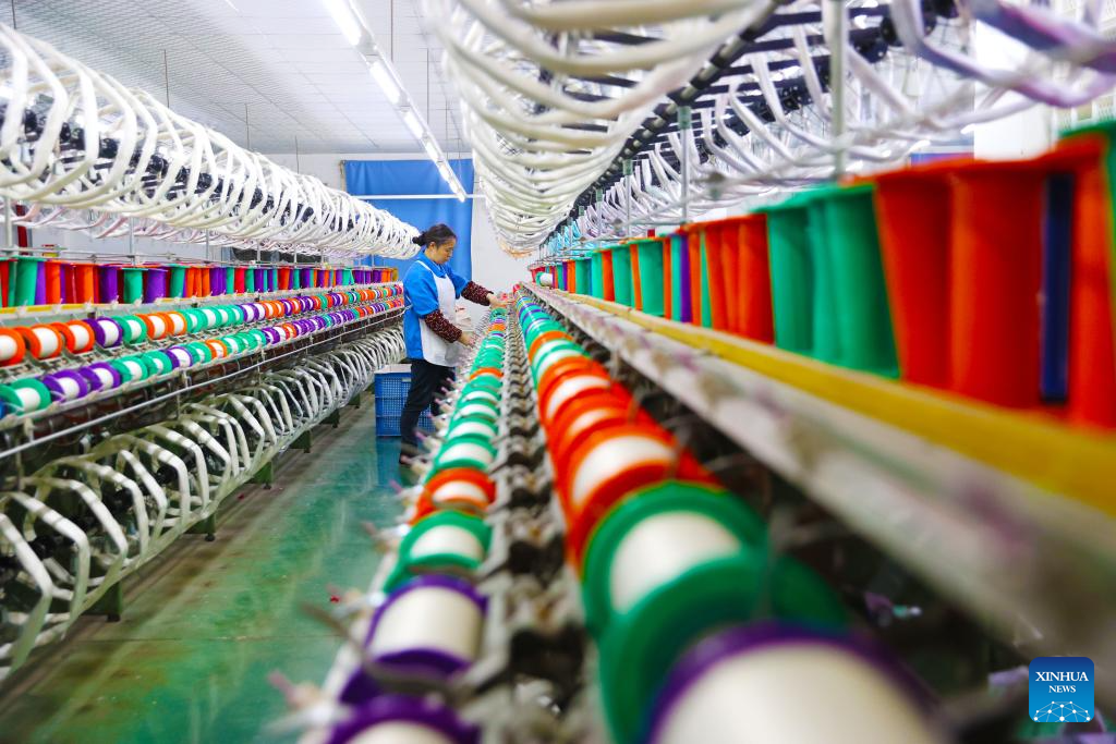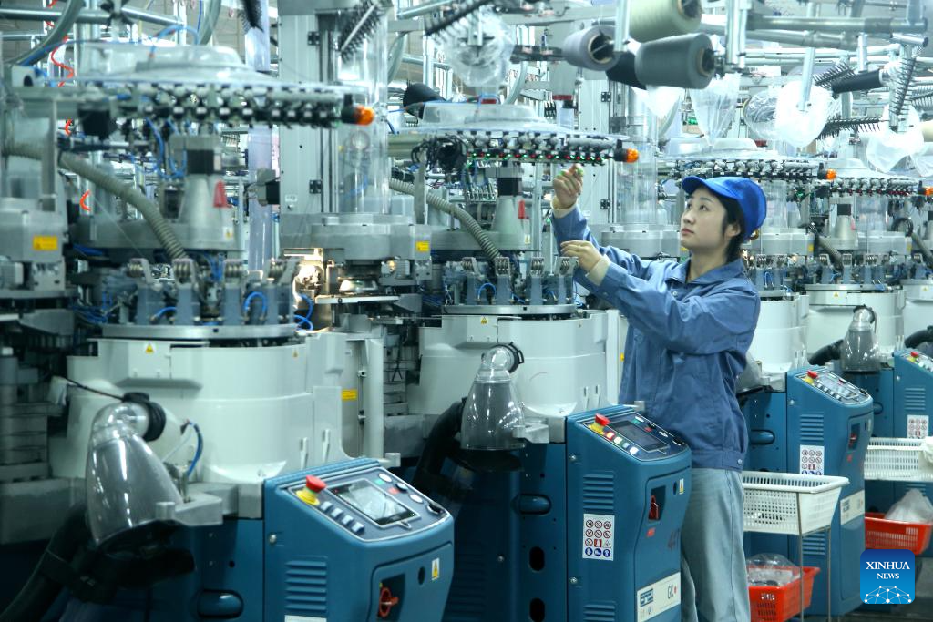 A worker works on a production line of a sock company in Qingdao, east China's Shandong Province, on March 16, 2026. China's value-added industrial output, an important economic indicator, went up 6.3 percent year on year in the first two months of 2026, data from the National Bureau of Statistics (NBS) showed on Monday.