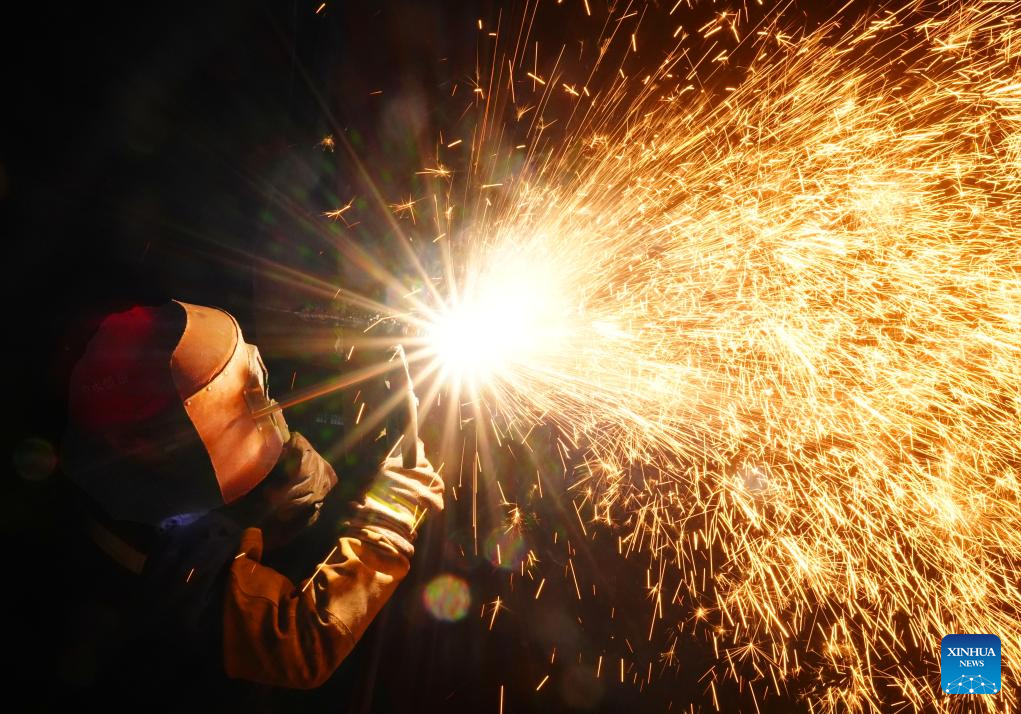 A worker welds at a steel company in an economic development zone in Hengshan County of Hengyang, central China's Hunan Province, on March 16, 2026. China's value-added industrial output, an important economic indicator, went up 6.3 percent year on year in the first two months of 2026, data from the National Bureau of Statistics (NBS) showed on Monday.
