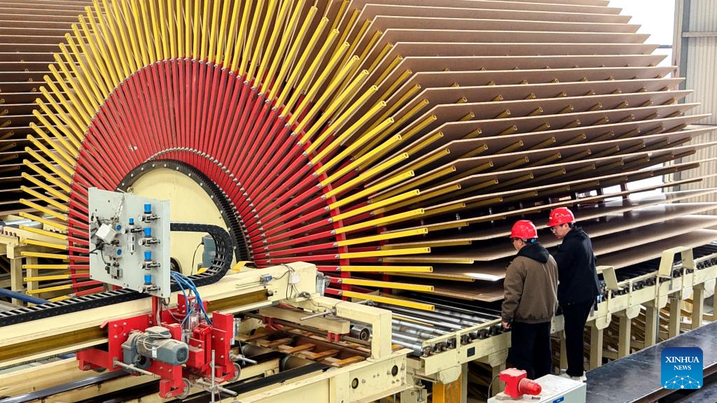 Workers work on a board production line of a wood products company in Pingyi County of Linyi City, east China's Shandong Province, on March 16, 2026. China's value-added industrial output, an important economic indicator, went up 6.3 percent year on year in the first two months of 2026, data from the National Bureau of Statistics (NBS) showed on Monday.