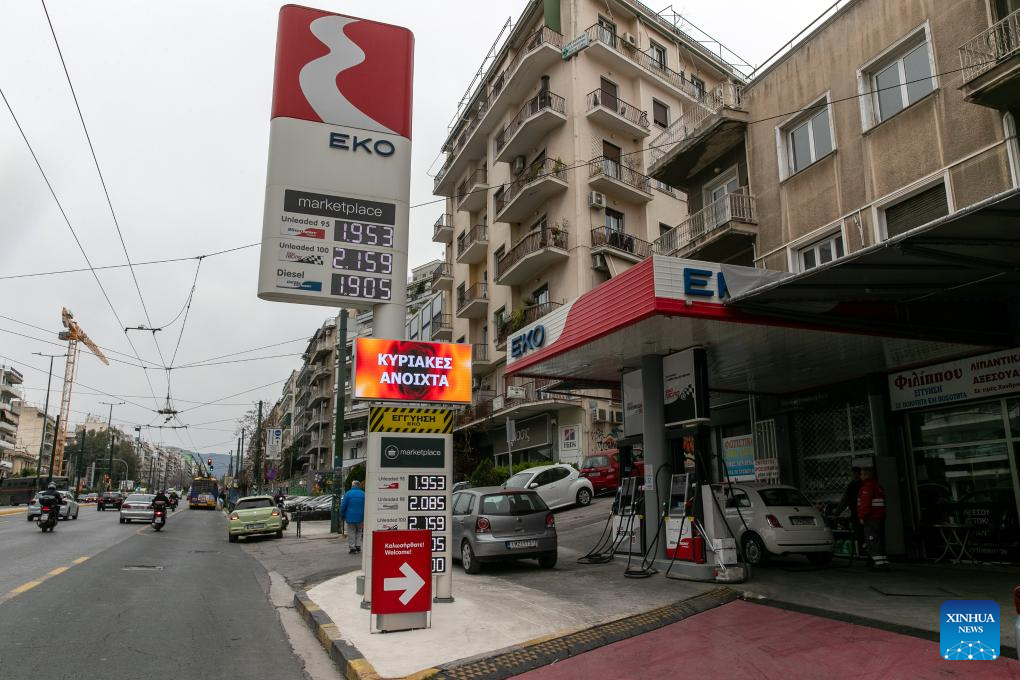 Photo taken on March 17, 2026 shows the gas prices displayed at a gas station in Athens, Greece. Gasoline prices have risen in Greece since the start of U.S.-Israeli military operations against Iran. (Xinhua/Marios Lolos)