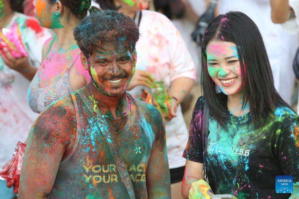 People smeared with colored powder pose for photos during the celebration of Holi festival in Pattaya, Thailand, March 13, 2026. (Xinhua/Rachen Sageamsak)