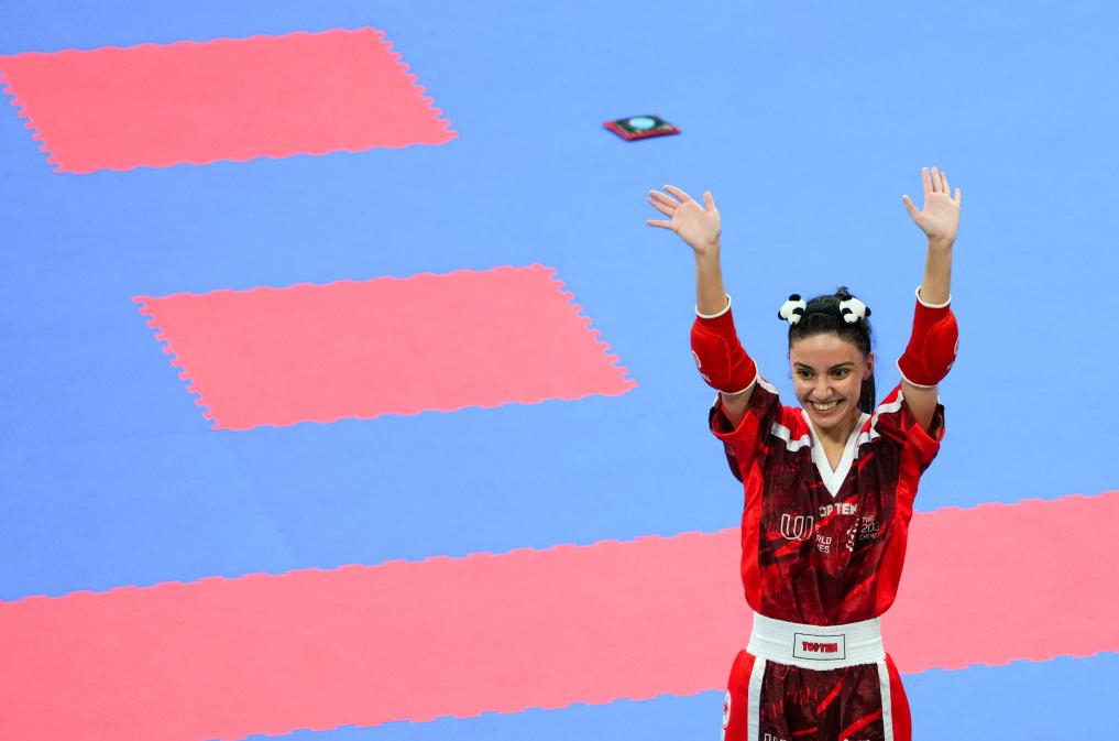 8月13日,土耳其选手克伦奇在比赛中战胜危地马拉选手阿吉拉尔后庆祝。当日,2025年成都世运会自由搏击女子半接触50公斤级半决赛举行。新华社记者 陈欣波 摄