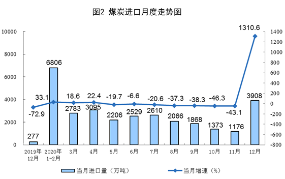 煤炭進(jìn)口增加。12月份,進(jìn)口煤炭3908萬噸,環(huán)比增加2732萬噸。2020年,進(jìn)口煤炭3.04億噸,比上年增長(zhǎng)1.5%。