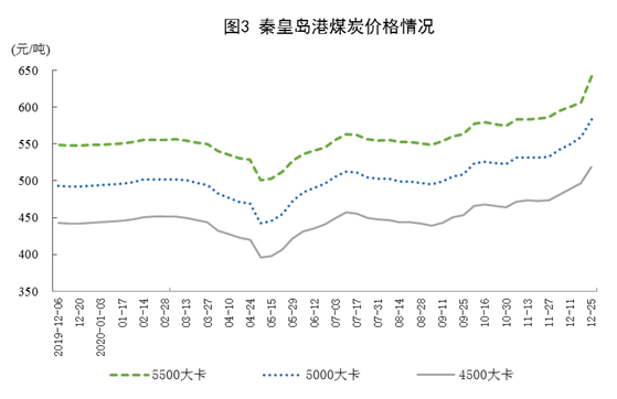 港口煤炭綜合交易價(jià)格上漲。12月25日,秦皇島港5500大卡、5000大卡和4500大卡動(dòng)力煤綜合交易價(jià)格分別為每噸642元、583元和519元,比11月27日分別上漲56元、50元和45元。