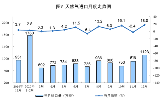 天然氣進(jìn)口由降轉(zhuǎn)增。12月份,進(jìn)口天然氣1123萬噸,同比增長(zhǎng)18.0%,上月為下降2.4%。2020年,進(jìn)口天然氣1.02億噸,比上年增長(zhǎng)5.3%。