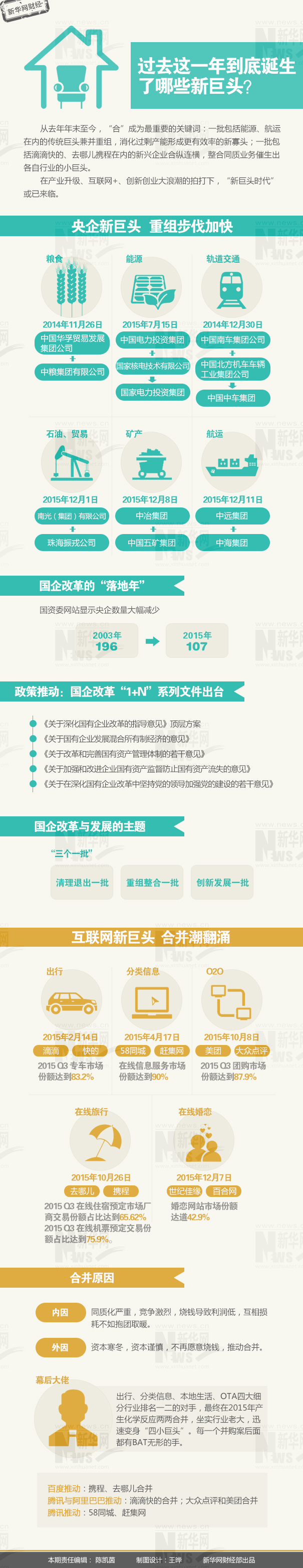 2015年,“央企艦隊(duì)”集結(jié)出發(fā),大重組、大整合時(shí)代開啟。年初,中國南車、中國北車——中國最大的兩家軌道交通裝備制造商在分開15年后再度合并。5月,國家核電和中國電力投資集團(tuán)宣布正式合并,新公司資產(chǎn)規(guī)模超過7000億元。