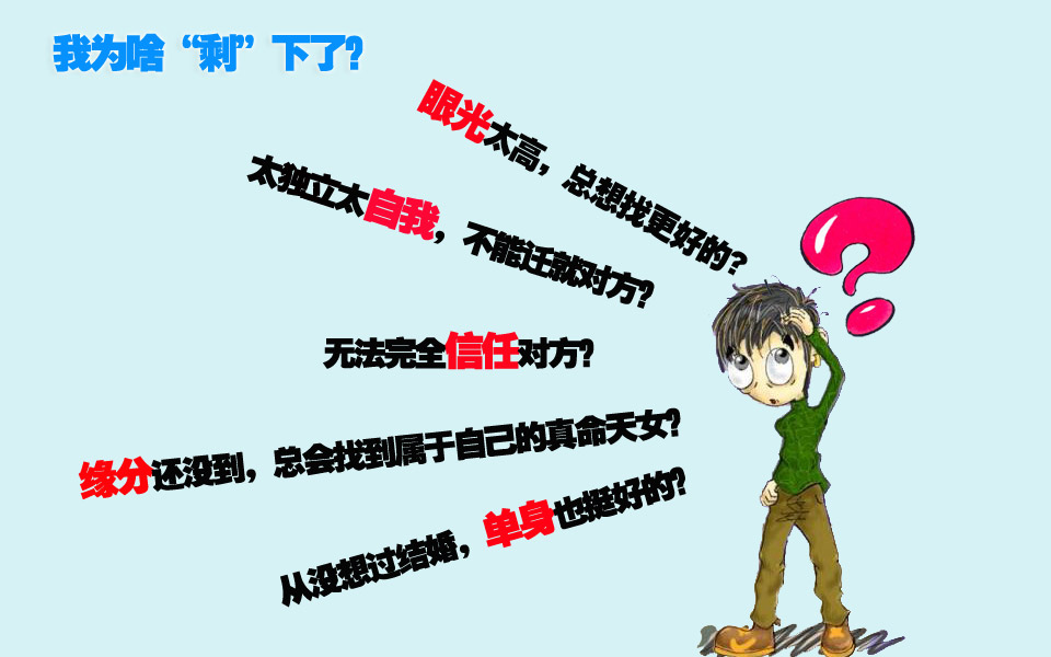 @尋找有緣人:我越來越發(fā)現(xiàn),剩男不管有多么的銼、衰、不靠譜,都能找到老婆,都還能找到條件不錯(cuò)的老婆。但是剩下的女人都是比較優(yōu)秀的,卻鮮有人問津。真很不科學(xué)!