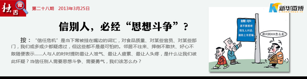 【可怕的“信任危機”】 賣包子的不吃自己做的包子,種菜的不吃自己種的菜,賣藥的不敢吃自己生產(chǎn)的藥,賣奶粉的則從不吃國產(chǎn)的奶粉……當造假作假成為一種風氣,甚至成為一種理所當然時,每個人能做的就只剩兩件事了:一個是只信自己,另一個是絕不信別人。