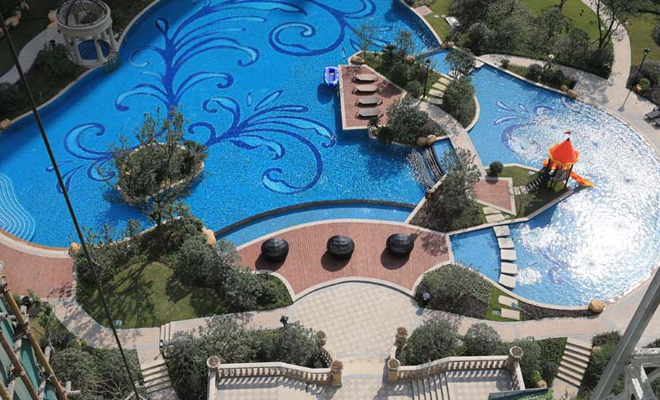 據(jù)資料顯示,大名城綠化率為41.5%,樓間距為160米,小區(qū)內(nèi)部區(qū)規(guī)劃擁有中央疊瀑和中央泳池。目前,大名城東區(qū)1400㎡無邊界游泳池已經(jīng)開放使用。記者實地走訪泳池周邊發(fā)現(xiàn),一名工作人員正在清理池內(nèi)雜物,該工作人員告訴記者,大名城工作人員會定時清理泳池及周邊景觀區(qū)域,保證小區(qū)內(nèi)部時刻干凈整潔??v觀東區(qū)整體景觀,池水清澈,周邊花卉植物、雕像噴泉錯落有致,景觀整體格調(diào)高端。