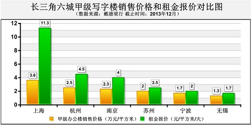 僅以蘇州為例,其甲級辦公寫字樓的平均售價(jià)已奔至“2字頭”;租金報(bào)價(jià)與南京同類物業(yè)的差距也已縮小至1.5元/平方米/天。 |