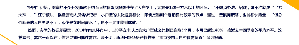 據黃媛分析,大戶型的熱銷主要原因有二。一是片區(qū)規(guī)劃的利好,周邊配套逐步成熟,吸引了主城區(qū)的客戶。而是其他片區(qū)單價昂貴,直接導致大戶型總價“離譜”,若想在南京改善居住品質,那么只有選擇還處于價格洼地的江北。黃媛認為300萬是個臨界點,如果大戶型總價在300萬以內,購房者是可以接受的,但如果超過300萬,開發(fā)商就會比較頭疼房子怎樣才能賣出去。