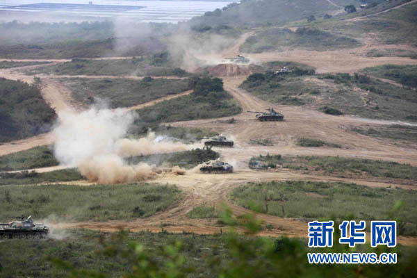 ????演習中,陸軍第39集團軍某紅軍旅坦克分隊向“敵”發(fā)起進攻(2015年9月18日攝)。