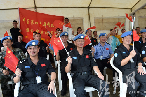 ????圖為蒙羅維亞時(shí)間10月24日,中國(guó)第四支駐利比里亞維和警察防暴隊(duì)徐曉偉政委(中)和隊(duì)員們一起為隊(duì)員們精彩表演加油 李金良攝
