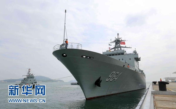 2月10日,駱馬湖艦在拖船的協(xié)助下駛離三亞某軍港。新華社記者 曾濤 攝