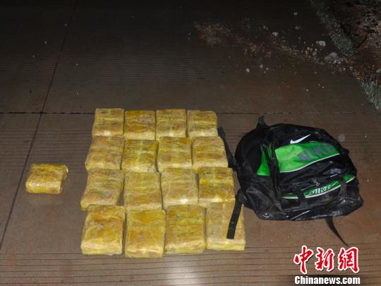 ????20時07分許,一名男子駕駛一輛無牌照摩托車冒著大雨,趁著夜色慢慢駛?cè)氩榫儸F(xiàn)場,當(dāng)看到執(zhí)勤官兵示意停車檢查時,該男子在距查緝現(xiàn)場15米處調(diào)頭逃跑,掉頭過程中從摩托車上掉下一個黑色雙肩包,執(zhí)勤官兵當(dāng)場從黑色雙肩包內(nèi)查獲用透明黃色蠟紙包裹的毒品可疑物17塊,凈重11.396公斤。
