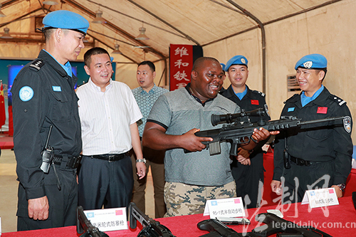 圖為利比里亞國防部副部長圣·杰羅姆·拉巴利觀摩防暴隊武器裝備展示