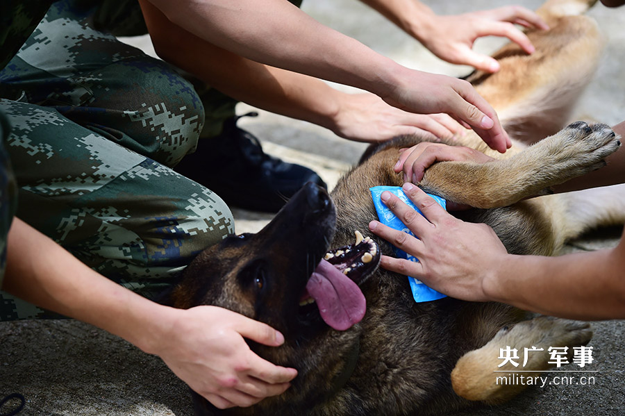 7月12日,警犬剛完成系列軍事訓(xùn)練,訓(xùn)導(dǎo)員用冰塊為它防暑降溫。冰塊是訓(xùn)導(dǎo)員的隨身必帶品。廖鍵攝