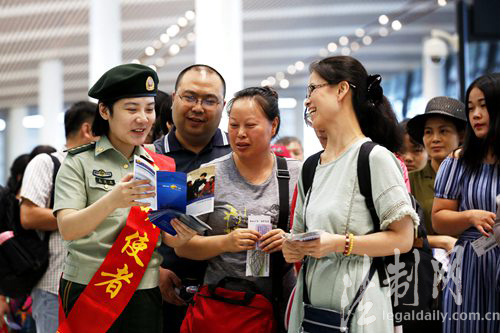 ????活動期間,該站在常州奔牛國際機場出境大廳張貼宣傳海報、發(fā)放宣傳畫冊、播放宣傳視頻,充分展示了該站近年來在提高邊檢服務水平、“法治邊檢”建設和執(zhí)法規(guī)范化等方面取得的工作成效,并通過有獎知識競答等互動方式,向廣大出入境旅客贈送印有“邊檢天天”卡通宣傳形象的遮陽帽、折扇、雨傘等紀念品,進一步普及邊檢出入境知識和政策法規(guī)。