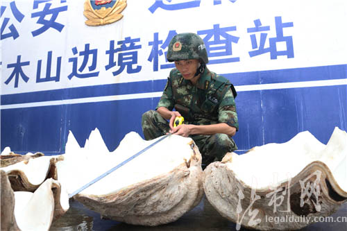 ????8月29日,廣西邊防總隊(duì)防城港邊防支隊(duì)楠木山邊境檢查站查獲國家一級保護(hù)動(dòng)物硨磲標(biāo)本3只,總重218公斤。