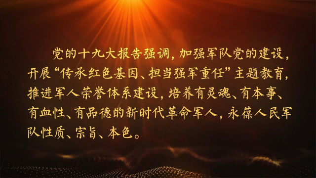 黨的十九大報告強(qiáng)調(diào),加強(qiáng)軍隊黨的建設(shè),開展“傳承紅色基因、擔(dān)當(dāng)強(qiáng)軍重任”主題教育,推進(jìn)軍人榮譽(yù)體系建設(shè),培養(yǎng)有靈魂、有本事、有血性、有品德的新時代革命軍人,永葆人民軍隊性質(zhì)、宗旨、本色。
