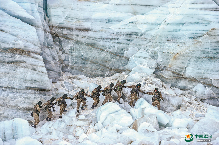 一路攀爬,巡邏隊伍來到了一片亙古冰川前面。這片冰川連鷹都飛不過去,曾有5名巡邏戰(zhàn)士犧牲于此?!霸谶@條生死路上,先輩與后人的血脈通過一串串新舊腳印傳承,盡管危險重重,但我們會義無反顧地走下去!”王旭堅定地告訴記者。