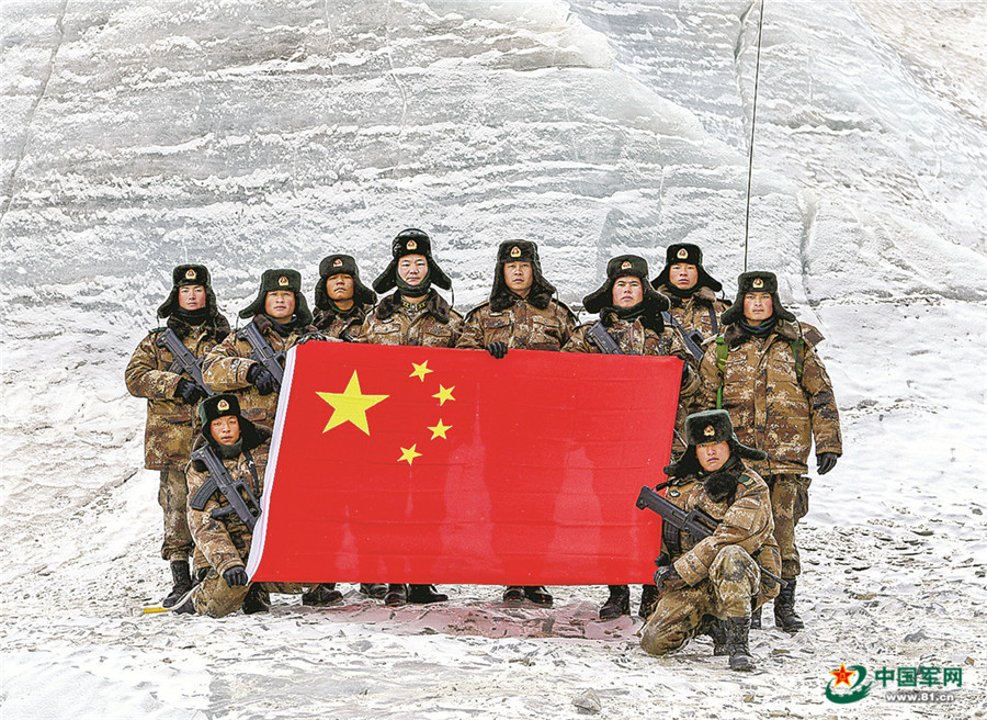 到達(dá)目的地后,官兵展開國旗向祖國和人民送上祝福。