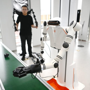 3月17日,在中国雄安集团数字城市科技有限公司具身智能训练场,工作人员对机器人进行具身智能训练。
