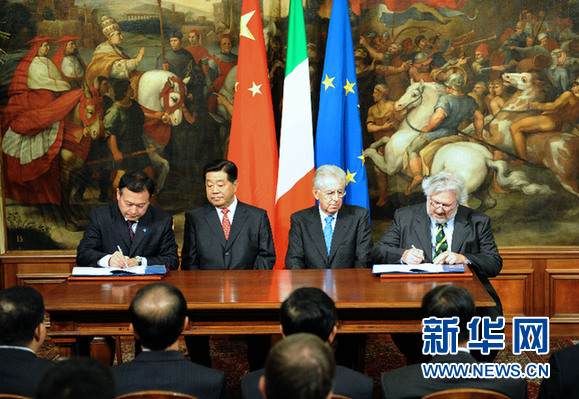 ????當?shù)貢r間11月28日,中國全國政協(xié)主席賈慶林在羅馬和意大利總理蒙蒂共同出席中意兩國電信、新能源汽車等領域合作項目協(xié)議的簽字儀式。(來源:新華社記者 李學仁 攝)