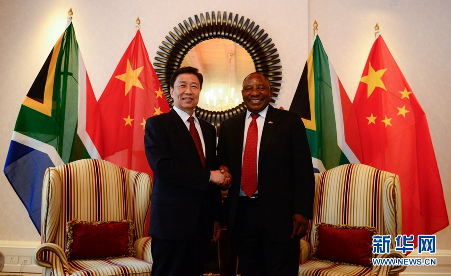 11月22日,在南非開普敦,中國(guó)國(guó)家副主席李源潮(左)與南非副總統(tǒng)拉馬福薩舉行會(huì)談。 新華社記者翟健嵐攝
