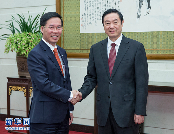 1月13日,中共中央政治局委員、中央書記處書記、中宣部部長劉奇葆在北京會見越共中央政治局委員、中央書記處書記、中央宣教部部長武文賞。新華社記者 崔新鈺 攝