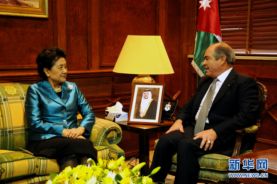 4月20日,在約旦首都安曼,約旦首相兼國防大臣穆勒吉(右)會見中國國務(wù)院副總理劉延?xùn)|。 新華社記者林曉蔚攝