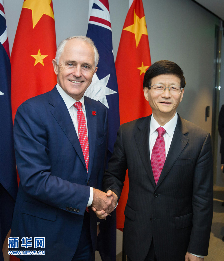 4月21日,正在澳大利亞訪問的中共中央政治局委員、中央政法委書記孟建柱(右)在悉尼會見澳總理特恩布爾。 新華社發(fā)(朱宏業(yè)攝)