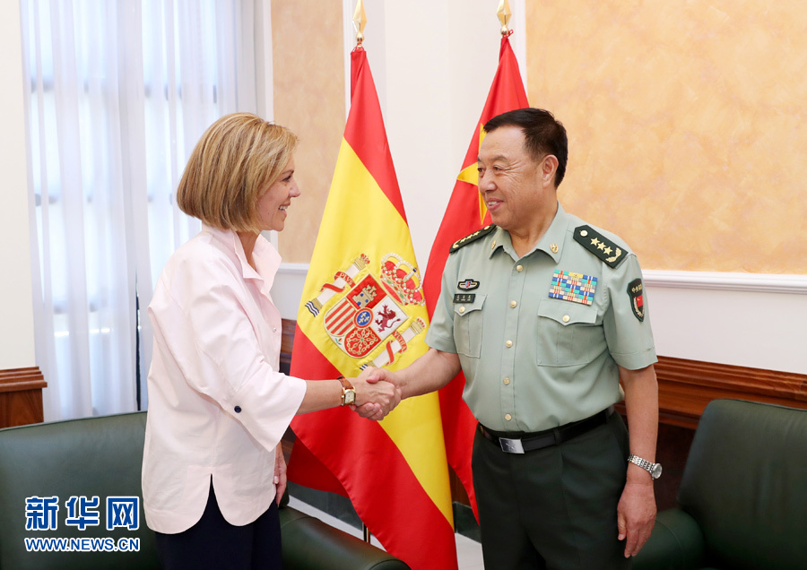 6月13日,中央軍委副主席范長龍(右)在馬德里會見西班牙國防大臣德科斯佩達爾。 新華社發(fā)(李曉偉攝)