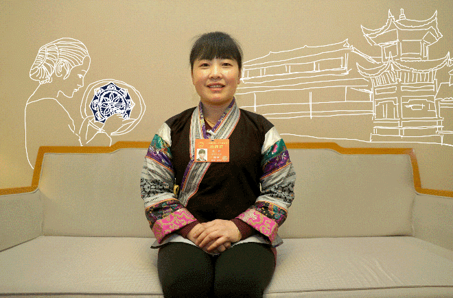 ??? ——全國人大代表蔡群在老家貴州畢節(jié)織金縣官寨鄉(xiāng)大寨村苗寨開了一家苗族蠟染刺繡公司,帶動(dòng)寨子里300多名外出打工的婦女一起回鄉(xiāng)創(chuàng)業(yè)。