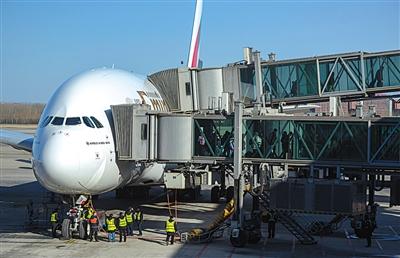 2月7日,一架飛機到達(dá)后,首都機場博維公司工作人員操作客梯廊橋與飛機連接后下客。圖片來源:新京報