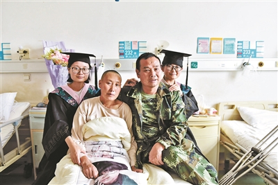 由于母親周玉梅需要在病床上休息,經(jīng)過醫(yī)生同意后,李夢(mèng)楠花20元為母親租了輪椅,在醫(yī)院的樓道和病房里與同學(xué)們一起拍了合影。照片里,周玉梅戴上了女兒的學(xué)士帽,微笑著面對(duì)鏡頭。