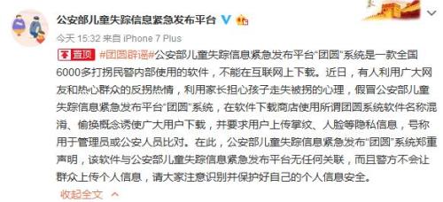 公安部?jī)和й櫺畔⒕o急發(fā)布“團(tuán)圓”系統(tǒng)鄭重聲明,該軟件與公安部?jī)和й櫺畔⒕o急發(fā)布平臺(tái)無(wú)任何關(guān)聯(lián),而且警方不會(huì)讓群眾上傳個(gè)人信息,請(qǐng)大家注意識(shí)別并保護(hù)好自己的個(gè)人信息安全。