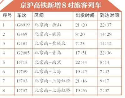 記者從北京鐵路局獲悉,調圖后,京滬高鐵將增加8對旅客列車,分別為北京南至唐山、威海、鹽城北、青島、南京、上海各1對,至上海虹橋動車組2對。