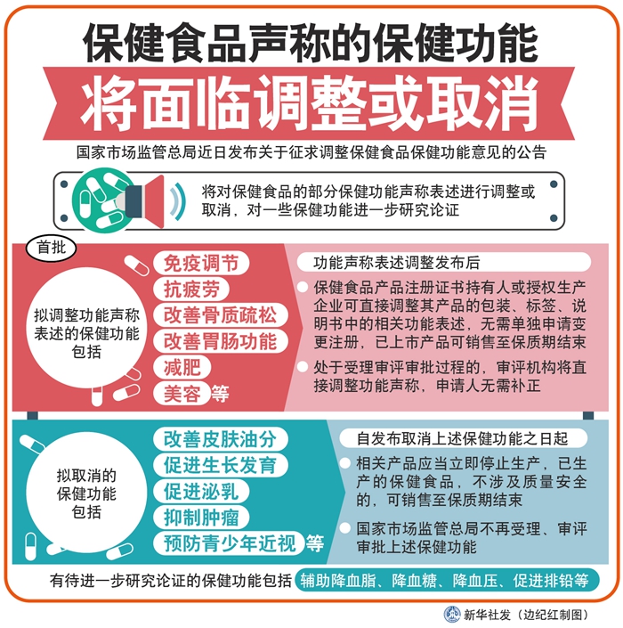 國家市場監(jiān)管總局在對不同歷史時期批準(zhǔn)的保健功能進行梳理匯總的基礎(chǔ)上,組織醫(yī)學(xué)、藥學(xué)、食品、營養(yǎng)等領(lǐng)域?qū)<疫M行多次論證,研究提出了調(diào)整保健功能的意見。堵塞保健食品功能聲稱被虛假宣傳的漏洞,提升消費者對保健食品功能聲稱的科學(xué)認(rèn)知和準(zhǔn)確判定,避免與藥品疾病預(yù)防和治療作用混淆。