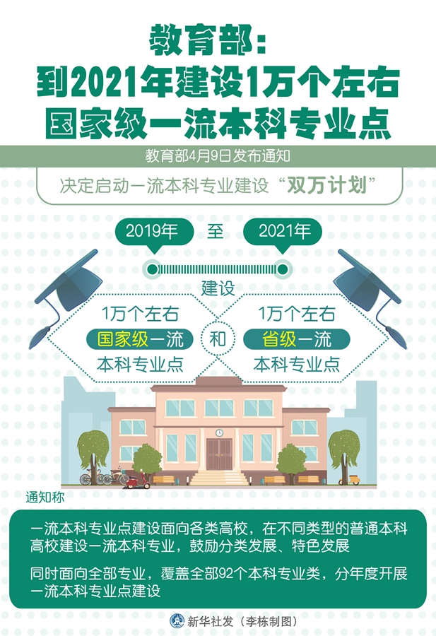 新華社北京4月9日電(記者施雨岑)教育部9日發(fā)布通知,決定啟動一流本科專業(yè)建設(shè)“雙萬計劃”,2019年至2021年建設(shè)1萬個左右國家級一流本科專業(yè)點(diǎn)和1萬個左右省級一流本科專業(yè)點(diǎn)。