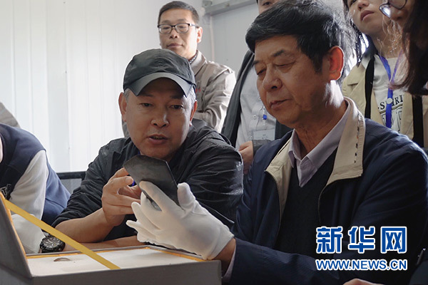 4月29日,考古學(xué)家研究討論黃山遺址新出土的玉鉞。 新華社記者 袁月明 攝