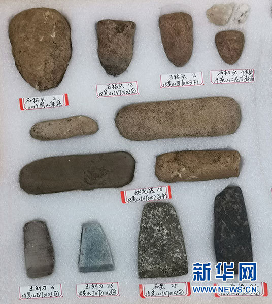 這是黃山遺址發(fā)掘出土的石鉆頭、石鑿、拋光器等制玉工具(4月29日攝)。新華社記者 桂娟 攝