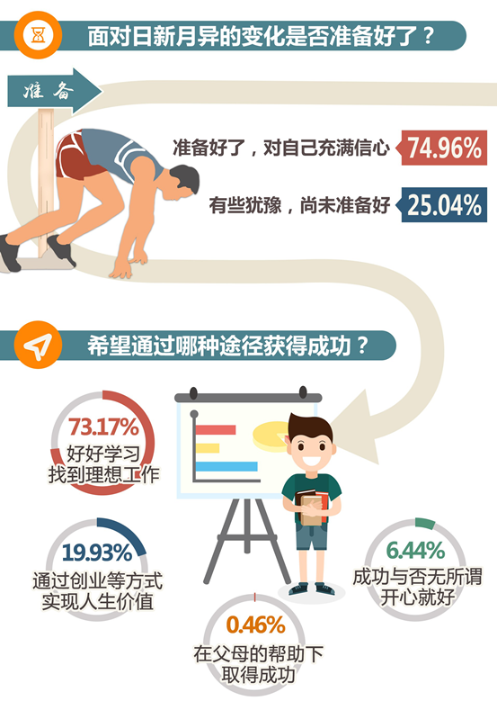 大學(xué)生的自信還體現(xiàn)在希望通過努力獲得成功。93.1%的受訪者希望“好好學(xué)習(xí),從事理想工作”“通過創(chuàng)新、創(chuàng)業(yè)等方式實現(xiàn)人生價值”。在采訪中,不少大學(xué)生表示“只要有想法就敢去做”“相信未來有無限可能”。中國地質(zhì)大學(xué)(北京)信息工程學(xué)院兼職輔導(dǎo)員王洪宇說,現(xiàn)在的大學(xué)生不拘泥于傳統(tǒng),更愿意參與創(chuàng)新創(chuàng)業(yè),他們甚至?xí)约簞?chuàng)立新工種,把青年特質(zhì)發(fā)揮到極致。分析認為,這一代大學(xué)生成長在國家快速發(fā)展、改革開放不斷深化、國際地位不斷上升、互聯(lián)網(wǎng)與生活緊密融合的時代,他們的成長環(huán)境更加優(yōu)越,視野更加開闊,這對他們的自我認知及性格形成有很大影響,他們更加自信。