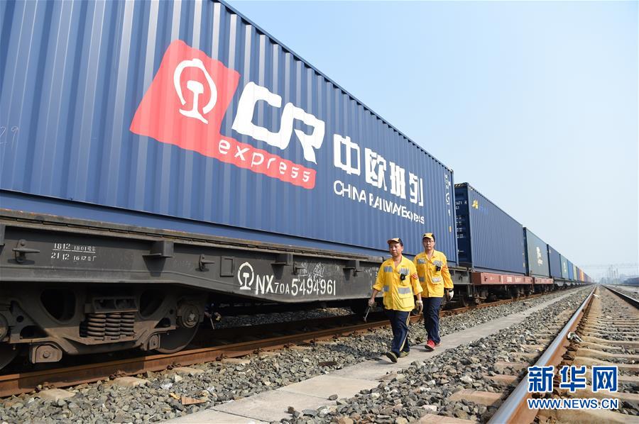 在位于重慶沙坪壩區(qū)的興隆場(chǎng)上行出發(fā)作業(yè)場(chǎng),進(jìn)行列檢作業(yè)的兩名貨車檢車員從中歐班列旁走過(2018年8月29日攝)。新華社記者 唐奕 攝