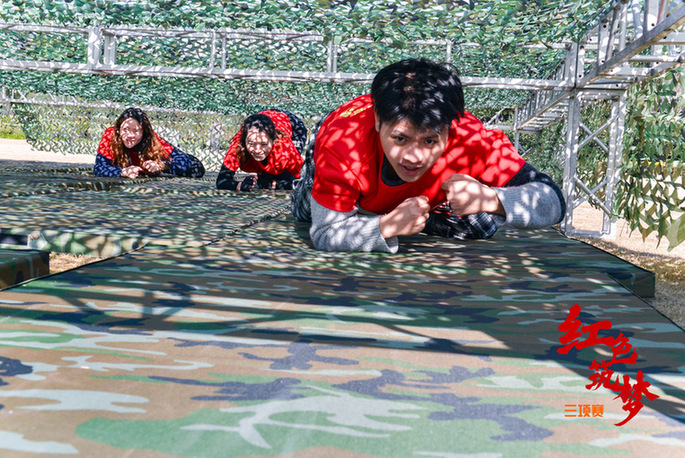 上午九時(shí),一支隊(duì)伍正合力將長繩和70面國旗串聯(lián)懸掛至旗海中,讓人聯(lián)想起第一面五星紅旗在開國大典廣場上飄揚(yáng)的場景;另一支隊(duì)伍的幾位隊(duì)員正用PVC管作為連接,合力吹氣將5個(gè)氫氣球吹爆,這是在通過游戲的形式致敬1967年的第一顆氫彈爆炸成功;還有一群隊(duì)員穿著救生衣、膠鞋扛著自己的隊(duì)友穿越洪水區(qū)、獨(dú)木橋區(qū)、沼澤地區(qū),還原98 年抗洪搶險(xiǎn)、5.12抗震救災(zāi)的場景……