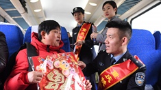 春節(jié)臨近,列車車窗上貼著窗花,車廂內(nèi)張燈結(jié)彩。為了讓老鄉(xiāng)們快樂回家,貴州團(tuán)省委組織的青年文藝志愿者與廣鐵集團(tuán)廣州客運(yùn)段動(dòng)車2隊(duì)的乘務(wù)員們一起在車廂表演起豐富多彩的文藝節(jié)目。